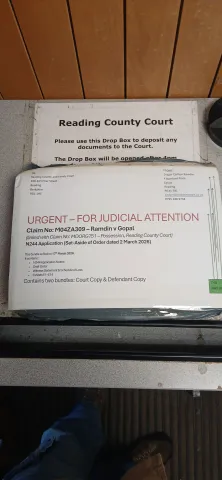 This disclosure records the verified physical filing of a complete N244 application bundle at Reading County Court on 17 March 2026 via the official court drop box.