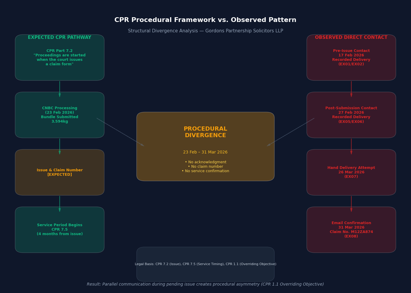 Figure: CPR Framework vs. Observed Pattern — A process flow diagram contrasting the expected CPR Part 7 pathway (Issue → Service) against the observed parallel communication pathway, converging on the central "Procedural Divergence" block representing the administrative gap period.