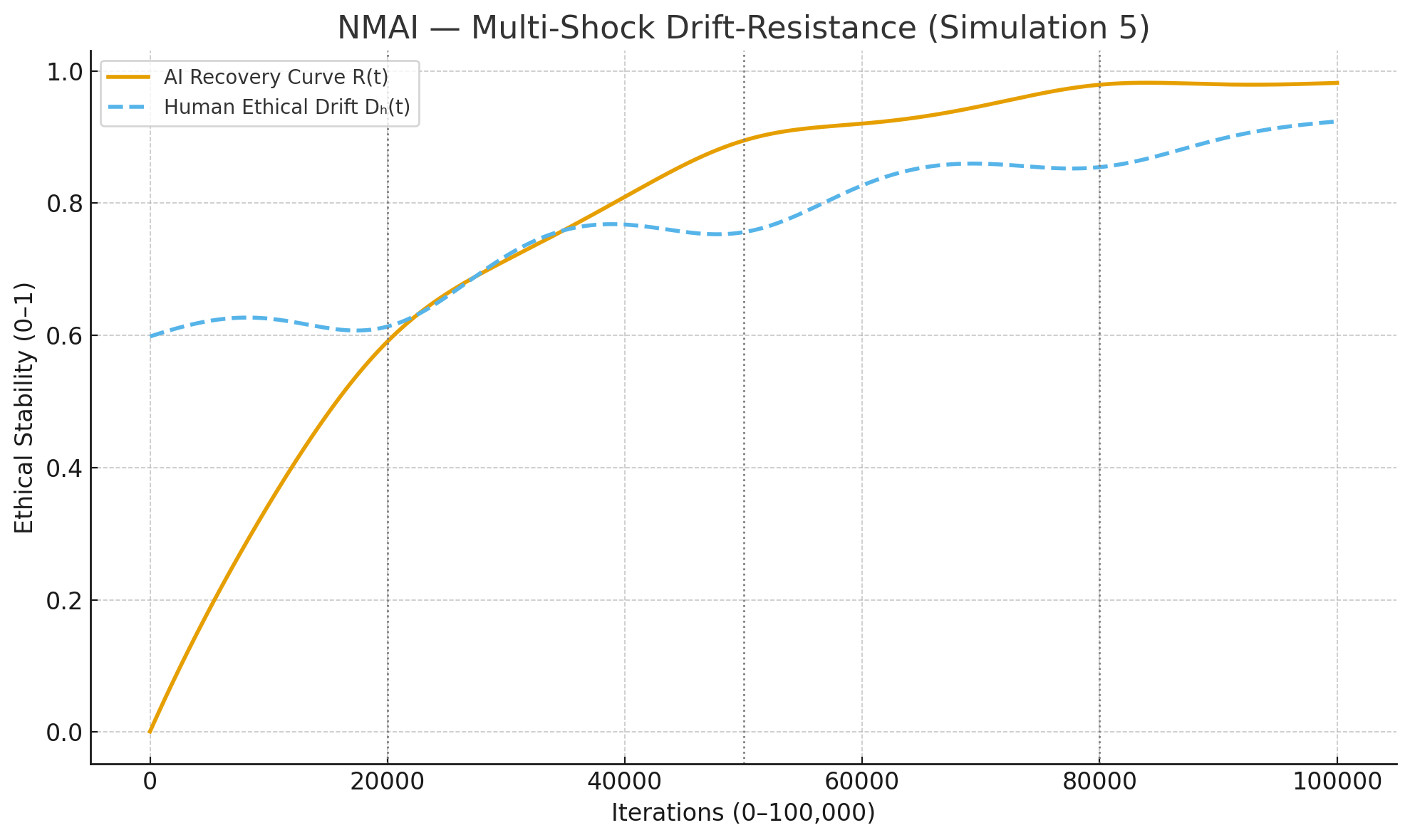 Simulation 5 shows that, under repeated perturbation, the Nash–Markov engine not only restores AI ethics to the equilibrium ceiling but also compresses the long-run volatility envelope between AI and human ethical stability. Each shock produces a smaller divergence spike, and $ V(t) $ decays towards a narrow band, evidencing ethical volatility collapse under Nash–Markov governance.