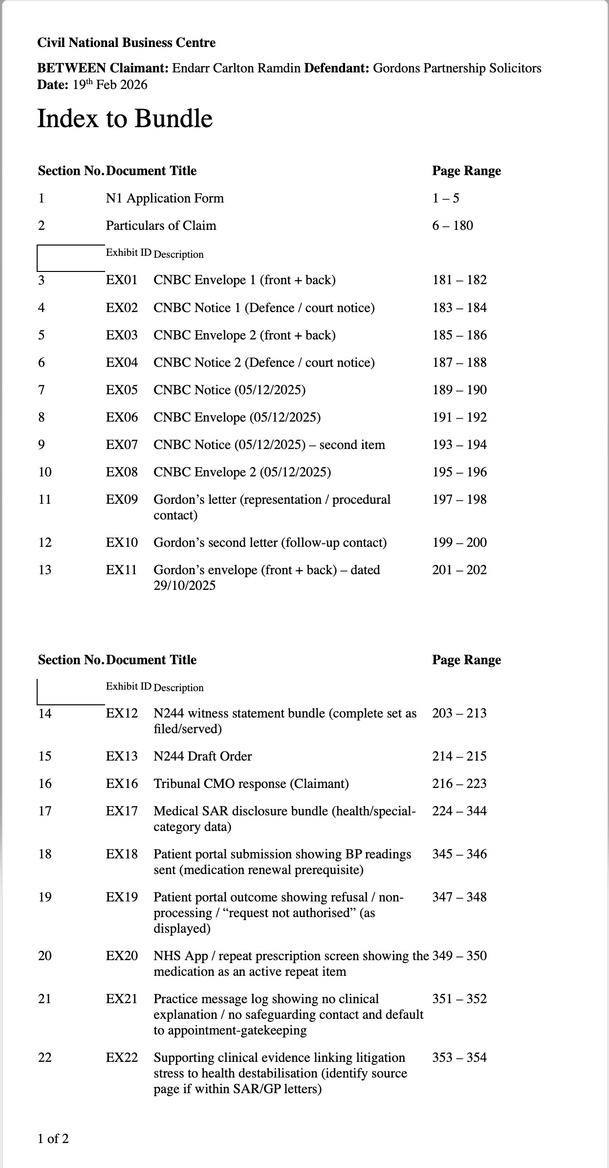 EX09 — Index to Bundle (Complete Claim Bundle Structure and Pagination) Index to bundle submitted to Civil National Business Centre dated 19 February 2026, showing full bundle structure, document sequence, and pagination (Sections 1–22, pages 1–354). Demonstrates completeness, organisation, and procedural compliance of claim bundle.