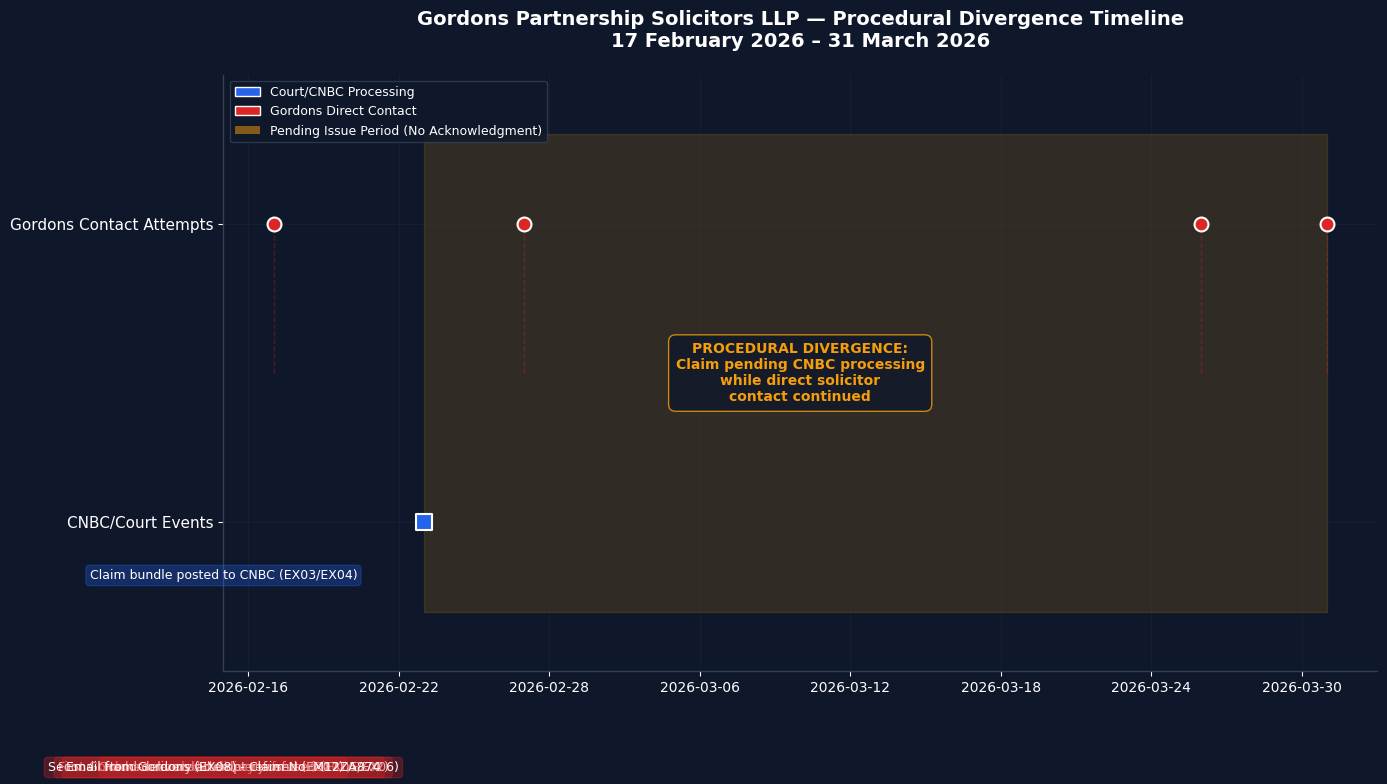 Figure: Procedural Divergence Timeline — Maps the chronological sequence (17 Feb – 31 Mar 2026) showing Gordons' contact attempts (red markers) against the single CNBC submission event (blue marker), with the amber band highlighting the 5-week pending issue period where no acknowledgment was received.